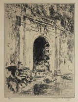 "Villa d'Este," c. 1910, etching by Margaret H. Wright. Image of fluted pilaster either side archway. Crest over arch, leafy bank left, pool right foreground. Signed below image, lower right, in pencil: Margaret H. Wright Lower left, below image: 6/50 Margaret Hardon Wright was an engraver who created views of European architectural subjects--especially in Italy and France--including this one of Villa d'Este.