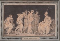 "Les Muses Présentées à Minerve (The Muses Presented to Minerva)," late 18th century, engraving by Jean-François Janinet, after a work by Jean-Guillaume Moitte. Minerva seated in full dress; four muses facing Minerva. Female figure at far left. Print border tinted green.