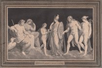 "Hercules Présenté à Jupiter et Junon (Hercules presented to Jupiter and Juno)," late 18th century, engraving by Jean-François Janinet, after a work by Jean-Guillaume Moitte. Jupiter and Juno seated at left, eagle facing right. Standing Hercules with two figures facing them. Figures on clouds. Border print tinted brown. (Number on object is 148/A1)