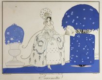 Giacometta, from "Masks and Characters of Italian Theatre," 1914, color lithograph, from an edition of "Le Journal des Dames et des Modes." The Journal des Dames et Des Modes aimed to appeal to aesthetes, and to reflect the intellectual and artistic atmosphere of Paris from 1912-14, the Belle Epoque. It distinguished itself from other periodicals of the time, most of which were illustrated by photography, by usign rich and vivid pochoir print...