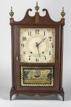 Brown wood cabinet, decorative columns at front corners, 3 brass urn shaped finials on top front, clear glass in door over clock face, painted glass lower, key lock. Inside; winding crank key, weights, pendulum, bell, instruction for proper operation and makers name pasted on rear cabinet inside; Invented, made and sold by Eli Terry and Sons, Plymouth Connecticut. In the 18th century, clocks were expensive items owned by few. By the early 1800...