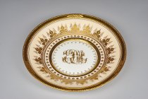 Dresden ware glazed porcelain, saucer, part of a set of three (1934.1.238.68.1 -.3), c. 1914, decorated by Ambrosius Lamm. The cream-colored saucer is heavily decorated with gold bands and beading around the outer edge and center. A row of gold leaf shapes is around the gold "EDA" monogram in the center of the dish. Mark of Charles Ahrenfeldt, Limoges, France; mark of A. Lamm, Dresden, Germany. Fine homes at the turn of the century dazzled wit...