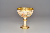 Dresden ware glazed porcelain sherbet cup decorated by Ambrosius Lamm. The pedestalled cup has a band around the middle with images of men and women (courting couples) in various poses. The inside is also highly decorated with overglaze gold flower designs. Mark of Charles Ahrenfeldt, Limoges, France (cup); mark of A. Lamm, Dresden, Germany (painted decorations). Fine homes at the turn of the century dazzled with table wares such as this sherb...